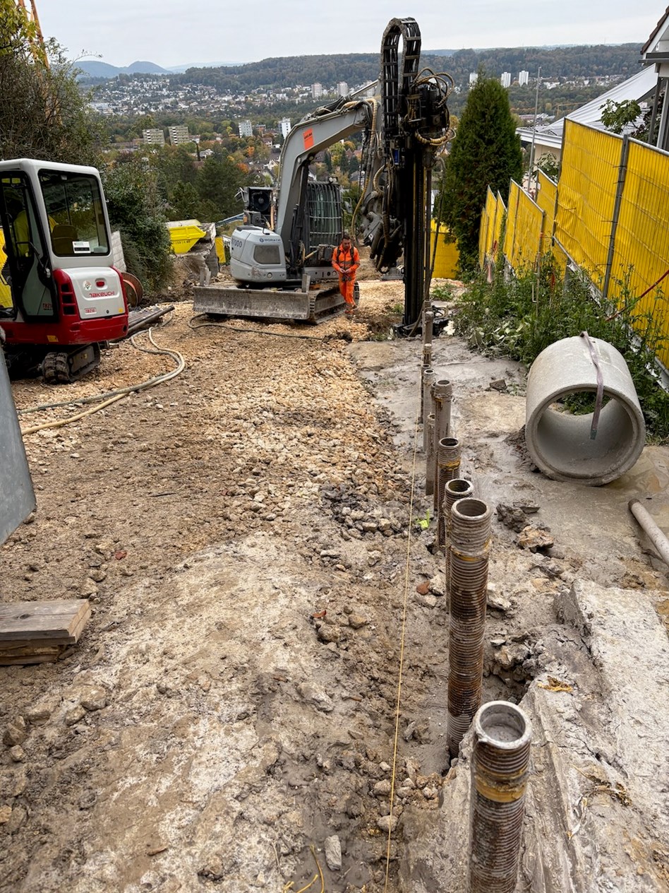 News / 17.10.2025 Baufortschritt: "Waldstrasse", Arlesheim Zur Sicherung der Baugrube werden Micropfähle gebohrt.