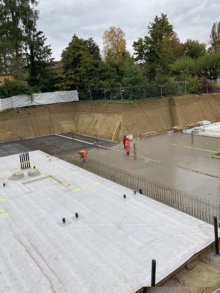 News / 17.10.2025 Baufortschritt: "Niklaus von Flüe-Strasse", Basel Die Bodenplatte Haus A wurde in Teilen betoniert.