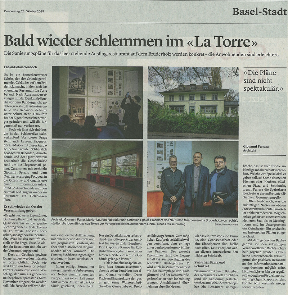 Der Informationsabend für die Nachbarschaft und Interessierten im leerstehenden Ausflugslokal "La Torre" auf dem Bruderholz fang regen Anklang. Die Sanierungspläne werden konkret und sollen dem Haus "zu altem Glanz" verhelfen.