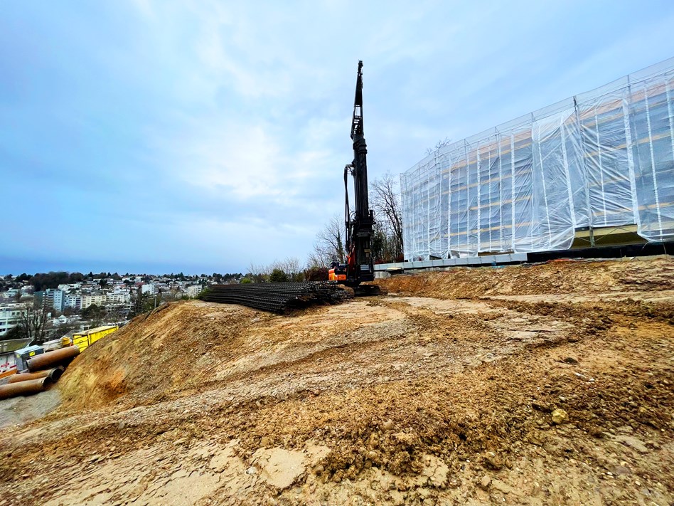 News / 28.11.2025 Baufortschritt: "Kirschtalrain 4", Binningen Das Bohrgerät für die Ausführung der Bohrpfahl-Wand wird installiert.