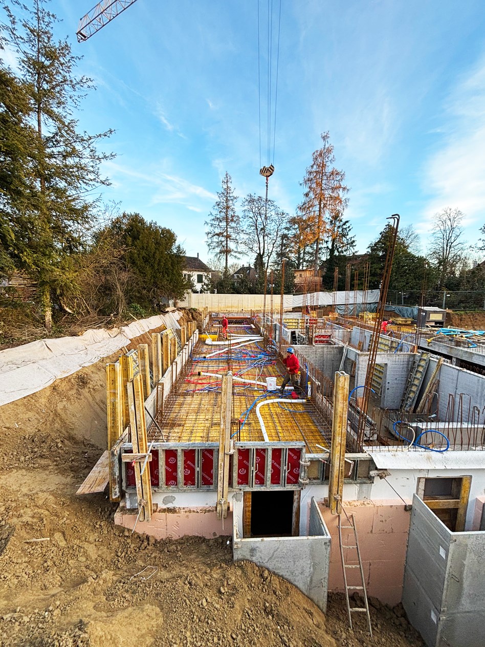 News / 05.12.2025 Baufortschritt: "Niklaus von Flüe-Strasse", Basel Einlagen der Haustechnik-Gewerke in der Decke über dem Untergeschoss von Haus A.