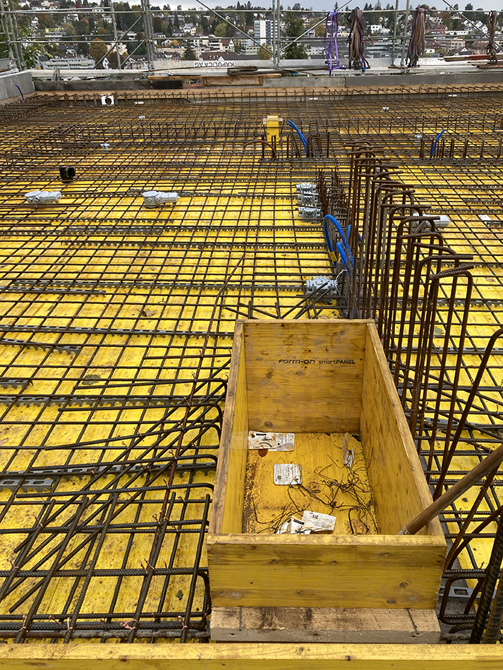 News / 29.10.2025 Baufortschritt: "Bruderholzrain 48", Binningen Die Decke über Ebene -3 wird gerade zum Betonieren vorbereitet.