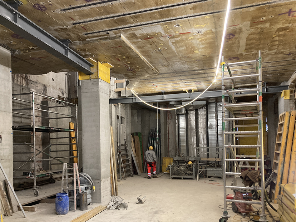 News / 10.10.2025 Baufortschritt: "Freie Strasse", Basel Stahlträger werden zur statischen Verbesserung unter der Decke über Erdgeschoss eingebaut.