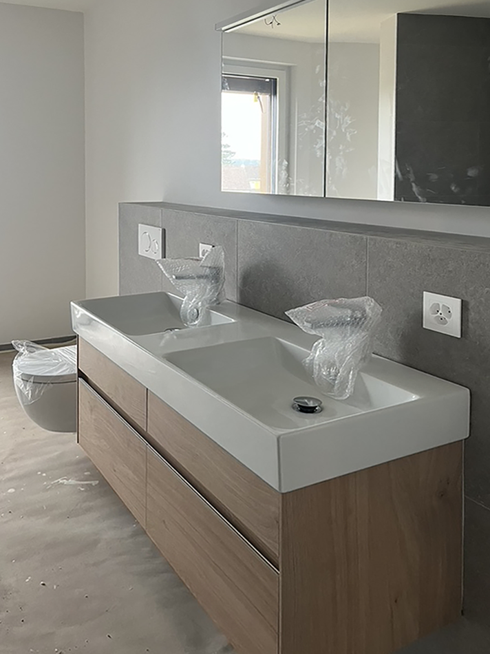 News / 09.10.2025 Baufortschritt: "Neuwilerstrasse", Oberwil Die Sanitärobjekte werden in den Bädern eingebaut.
