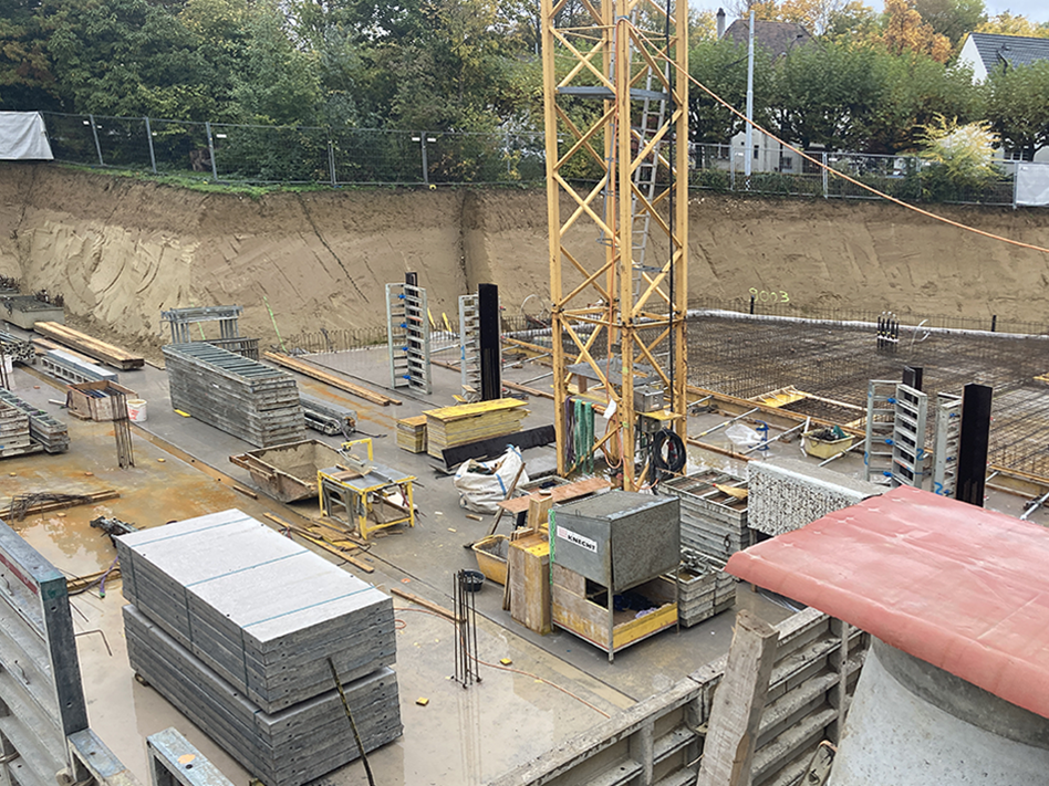 News / 24.10.2025 Baufortschritt: "Niklaus von Flüe-Strasse" Basel Alle Teilbodenplatten sind betoniert. Die Wände im UG werden zum Betonieren vorbereitet.