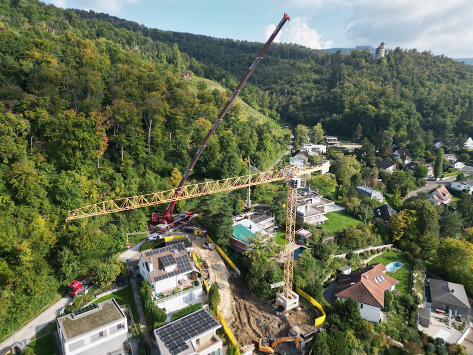 News / 10.10.2025 Baufortschritt: "Waldstrasse", Arlesheim Der Kran wird mit Hilfe eines Autokrans aufgestellt.
