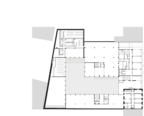 Dass der Altbau aufwendig umgebaut und erweitert wurde, ist eine Folge des Baugesetzes: wäre das Gebäude, das 1956 erbaut wurde, abgerissen worden, hätte weniger Fläche neu bebaut werden dürfen. Deshalb war es nur innerhalb der besehenden Struktur möglich, die alte Hofebene um ein komplettes Geschoss abzusenken – so konnte zu den alten drei geschossen ein neues zusätzliches Geschoss natürlich belichteter Klassenzimmer, Büros und Gymnastikräume gewonnen werden.