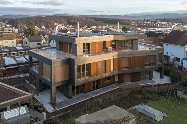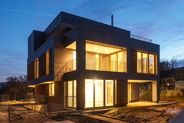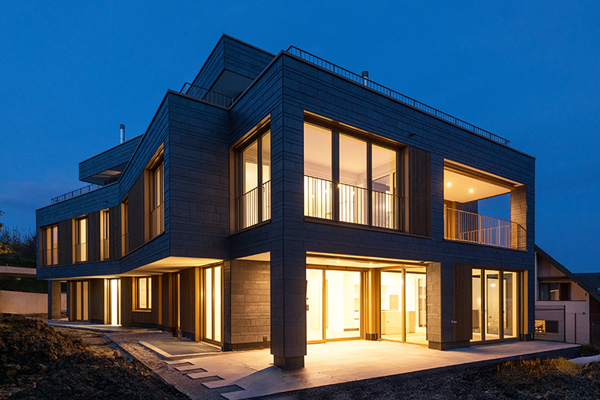 Die moderne Fassade besteht aus einem Zusammenspiel von ‚harten‘, metallischen Elementen und ‚weichen‘, hölzernen Füllungen die Wärme vermitteln. Das Fassadenkonzept bietet ein Maximum an Grundrissindividualität. Die Schieferfassade wird unterbrochen durch Holzelemente in welchen die Fenster dazwischen liegen. Es handelt sich um eine hochwertige, unterhaltsarme Fassade. Die Anordnung der Fenster innerhalb des Bereichs der Holzelemente, steht den Nutzern frei, wodurch eine hohe Individualität der Raumaufteilung entstand.
